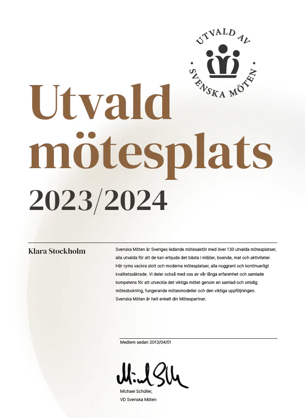 Att vara utvald är ett privilegie och en benämning som bara de allra bästa mötesplatserna i Sverige får lov att använda. Den innebär att när du bokar ditt möte hos oss på Klara så kan du känna dig trygg med att är vi är en mötesplats där Svenska Möten garanterar att du får uppleva en unik, fristående, hållbar och Svanenmärkt mötesplats av högsta kvalitet. Det är krävande och viktigt att arbeta långsiktigt med hållbarhet inom alla delar av verksamheten och om du undrar vad som krävs för att bli utvald av Svenska Möten läs mer om det här.